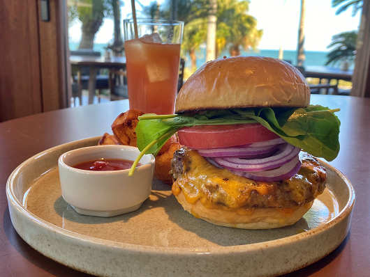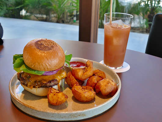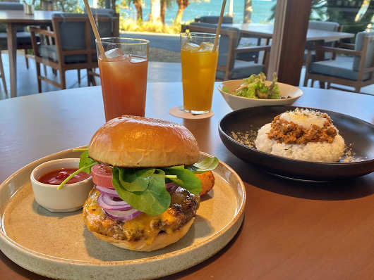 私たちは海に面した席に座ったので、しばらく外の景色を眺めていると料理が運ばれてきました。手前がりゅうママの注文したLDKバーガーで、その奥にあるのが私の注文した宮崎県産鶏キーマカレーとサラダです。ドリンクは南国らしいマンゴージュースとガヴァジュースを注文しました。