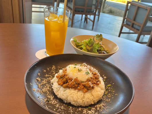 私の注文したマンゴージュースと宮崎県産鶏キーマカレー、サラダです。キーマカレーの上には半熟卵が乗っていました。