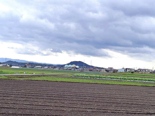 この辺りは昨年末に訪れた時にコウノトリを見たところなので、田んぼのどこかにコウノトリがいないかと周囲をキョロキョロと見回していると、田んぼや畑が広がる奥のほうに不思議な球形の物体が数個ほど集まっているのが見えました。