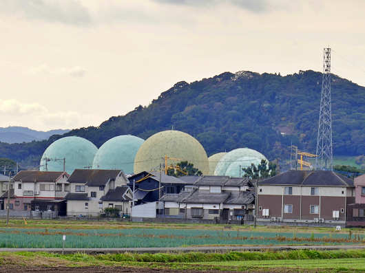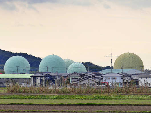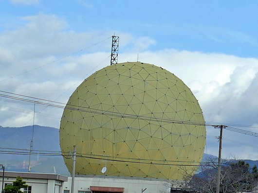 この画像は熊本県の道の駅「七城メロンドーム」の巨大なメロンですが、太刀洗通信所の球形ドームとよく似てますよね。でも太刀洗通信所の球形のドームは「レドーム」と呼ばれて、中にはパラボラアンテナが入っていて、アンテナの保護や向きを察知されないようにドームで覆われているそうです。