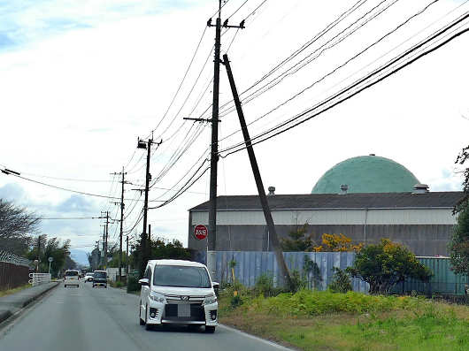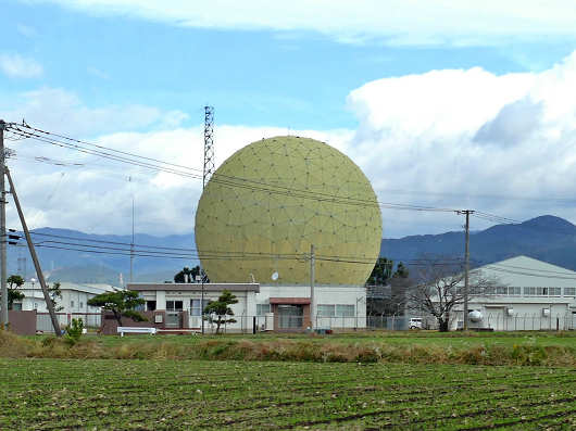 球体の後ろにはアンテナ櫓が立っていて、一緒に撮影したら巨大なメロンにも見えました(笑) 帰ってから詳しく調べたら、ここは「太刀洗通信所」といって、防衛省の特別機関の情報本部に所属する設備だそうで、日本全国に10か所しかない上空を飛び交う様々な電波を収集しているところでした。ここは防衛省の最高機密に関するような設備ですが、あまり近くをウロウロしていたら職務質問されていたかもしれませんね(笑)