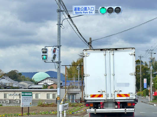 不思議な球体が見える道路を行ったり来たりしましたが、交差点に差し掛かった時に撮影したら、信号機には運動公園前と書かれていました。この辺りで運動公園といえば「筑前町多目的運動公園」なんでしょうか?