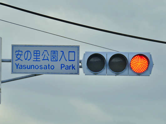 寄り道をしてしばらく巨大な球形ドームを見物をしていたので、本来の目的地のわらかがしの展示場所から外れてしまったので、一旦国道386号へ出て先へ進んで行くと「安の里公園入口」と書かれた交差点が見えてきたのでここを右折しました。