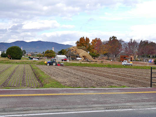 交差点を右折すると田畑が広がっていますが、その奥には巨大なわらかがしが小さく見えていました。