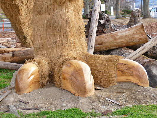 足元を見ると爪も大きな木を削って精巧に作られていました。全国には色んな案山子祭りがあって、九州でもこの時季は各所に案山子が飾られていますが、これほど巨大で精巧なわらかがし(案山子?)は他では見たことがありません。