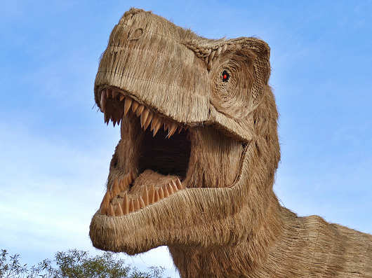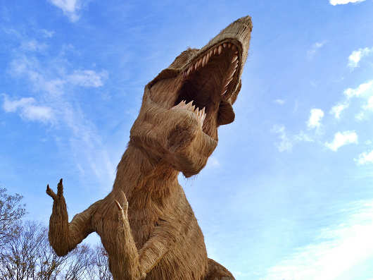 昨年のテーマは「鶏と卵」だったので、ほのぼのとしたわらかがしでしたが、今年は肉食恐竜の頂点に立つティラノサウルスなのでかなり迫力がありますね。