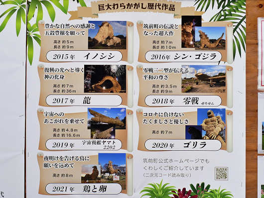 ここには歴代の巨大わらかがし作品の写真もありましたが、年度を見ると筑前町ではコロナ禍でも新型コロナに負けないようにと、毎年巨大わらかがしを作り続けていたんですね。