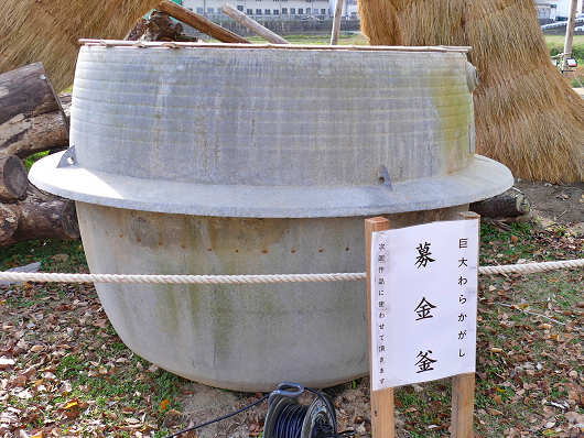 ここではわらかがしの展示の時には、必ず足元にこの巨大な大釜も登場しますが、今まで何のために置いているのか分かりませんでしたが、今回訪れてみると大釜の前には「募金釜」と貼り紙がありました。これでこの大釜の役目がやっと判明しました(笑)