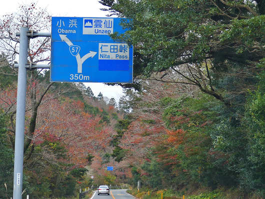 雲仙市へ向かって山道をどんどん登って最高地点辺りまで来ると、雲仙岳ロープウェイや平成新山が間近に望める仁田峠への分岐がありますが、空にはさらに雲が広がってきて、今にも雨が降りそうになって来たので、当初予定していた仁田峠も残念ながらパスです。