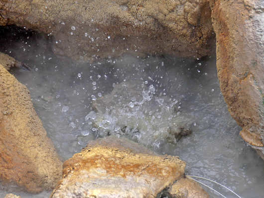 湯けむり橋の上から地獄を眺めると、沸騰したお湯がボコボコと盛んに噴き出していました。