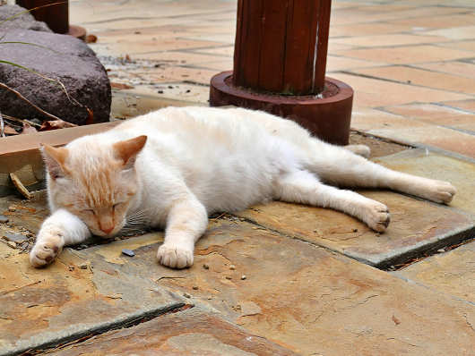 雲仙地獄は地熱の影響で遊歩道もポカポカと温かいので、ニャンコも気持ちがいいのか?死んだようにぐっすりと眠っていて、近づいてもピクリとも動きませんでした(笑)