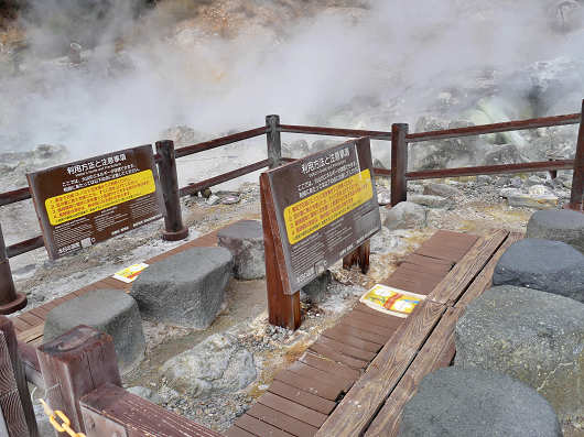 清七地獄の横には地獄を跨ぐように架けられた「湯けむり橋」があって、この橋を渡ってさらに先へと進みます。辺り一面は地獄からの噴気が立ち込めていてメガネは真っ白に曇るし、温泉特有の硫黄の匂いがプンプンしています。でもりゅうママはこの匂いが大好きなんですよね(笑)