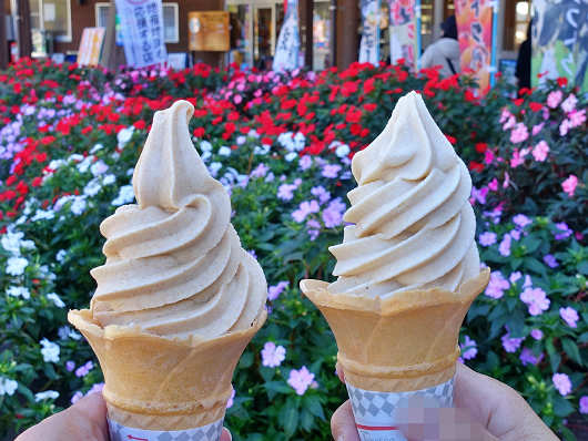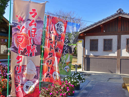 ここで幟に書かれていたソフトクリームを買いましたが、左は私が買った「松梅 ほし柿ソフトクリーム」で、右はりゅうママの買った「ラムほし柿ソフトクリーム」です。干し柿のソフトクリームって他では見たことがありませんが、りゅうママは数年前にここでこのソフトを食べて美味しかったことをしっかりと覚えていました(笑)