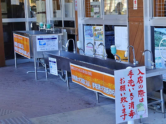 ソフトクリームを食べ終えたら物産館へ向かいましたが、入口には手洗い用の蛇口がズラリと並んだシンクが置かれていました。手の消毒用アルコールはどこの道の駅でも置かれていますが、手洗い用シンクが置かれている道の駅は初めて見ました。しかも蛇口の数が半端ないですね(笑)