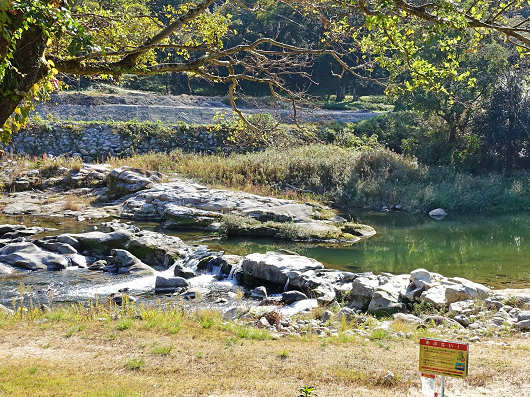 物産館で買い物を済ませたら、もう少しだけ敷地内を散策しました。物産館の裏手には川が流れていて、夏場には水遊びもできるようでした。この川はバルーンフェスタの会場になっている嘉瀬川の上流部です。