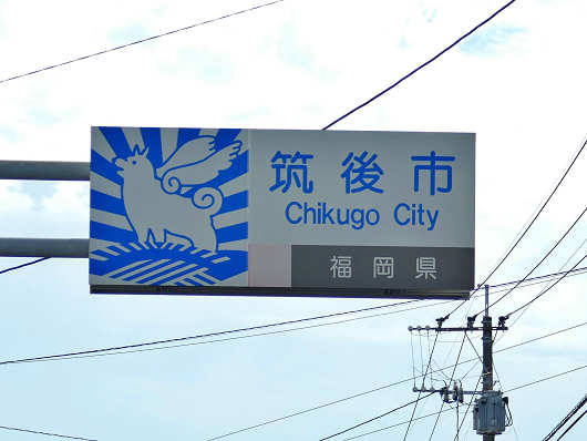テリーヌ食堂がある小郡市からは、久留米市街地を通り抜けてさらに進んで筑後市へと入りました。今回の記事はこの標識に描かれている羽の生えた不思議な犬についてです。