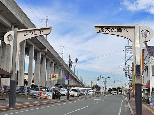 筑後市へ入ってから最初に寄ったのは「 JR羽犬塚駅(はいぬづかえき)」です。画像に写っているのは九州新幹線の高架ですが、在来線の鹿児島本線はこの高架の下を走っていて、JR羽犬塚駅もこの高架の下にあります。道路上には「ようこそ 羽犬の街へ」と書かれた看板も見えていますが、羽犬(はいぬ)って初めて名前を聞く人には何のことだか分からないでしょうね。
