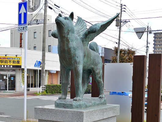 そしてJR羽犬塚駅前にも羽の生えた犬の銅像が建っていました。ここを訪れるのは2度目ですが、初めてここを訪れてこの銅像を見た時には、映画かアニメに出てくる架空の動物なんだろうか?なんてちょっと不思議に思っていたんですよね。