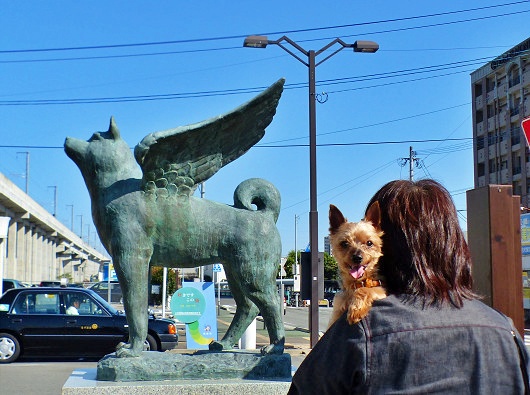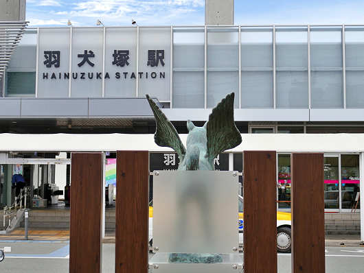 この羽が生えた犬の銅像は駅を正面して眺めると、不透明なアクリル板が設置されていて、下半身が見えないようになっていました。これってもしかしてお尻が見えないように隠しているんでしょうか?(笑)