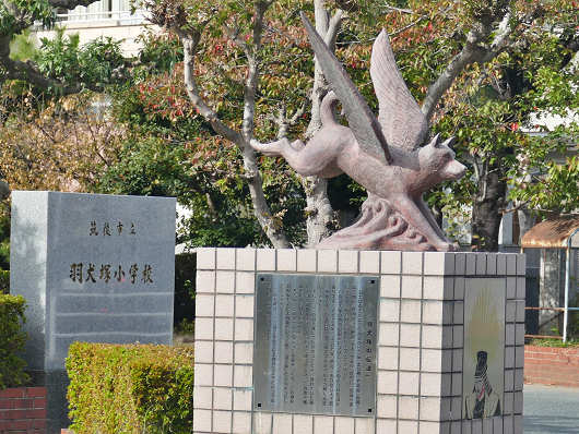次に訪れたのは羽犬塚小学校です。ここには台座に豊臣秀吉が描かれた羽犬の像がありましたが、まさに羽が生えたように飛び跳ねる犬って感じですね。