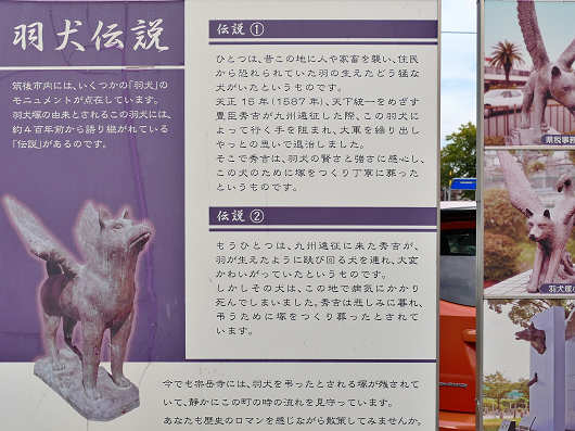 ここにはこの様な説明板もありました。これによると人や家畜を襲う羽の生えた獰猛な犬を豊臣秀吉が退治したという伝説と、もう一つは豊臣秀吉が九州征伐の時に連れてきた羽が生えたように飛び跳ねる愛犬が、この地で死んだので塚(墓)を造って弔ったとする二つの説があるそうです。