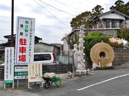 右折した先は曲がりくねった狭い道ですが、300mも進むと「かえる寺(如意輪寺)」の専用駐車場の看板と、巨大な五円硬貨、8匹のカエルが重なり合った石塔のような像が見えてきます。このすぐ右が10台ほどの車が停められるかえる寺の駐車場です。