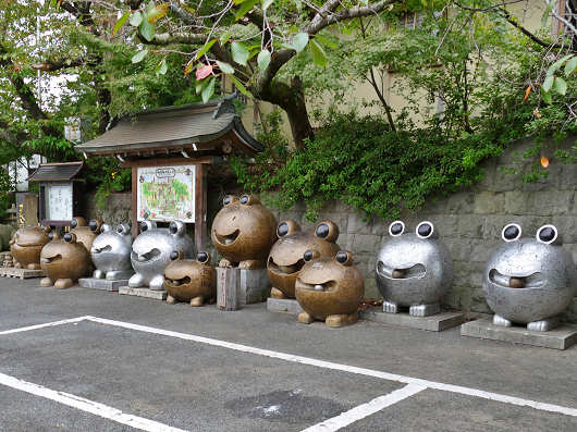 狭い通路を抜けると駐車場のような広場になっていて、ここにもたくさんのカエルがいました。地面には白線が引かれていたので、ここで車のお祓いができるんでしょうね?