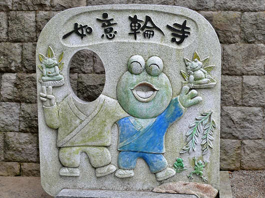 そしてズラリと並んだカエルの端っこには、顔ハメ石とでも言うんでしょうか?如意輪寺と刻まれた顔ハメパネルのような石板もありました。