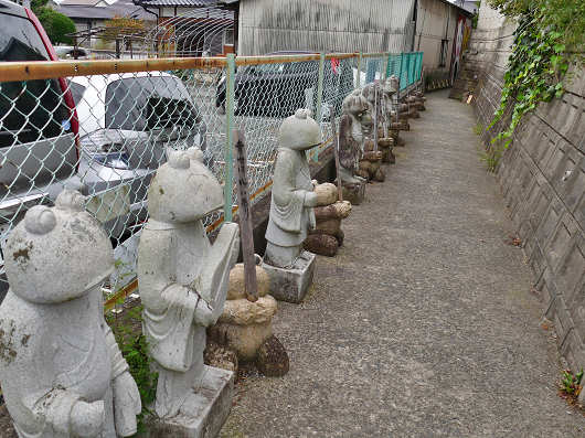 行き交う人がすれ違えないほどの狭い通路(参道?)には、たくさんのカエルのお坊さんがズラリと一列に並んで参拝者をお出迎えです。手に持っている板には「ありがとう」などの言葉が書かれていて、いきなりほっこりするような気分になりました(笑)