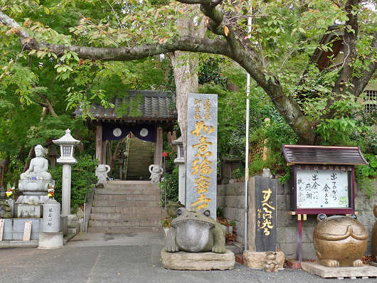 巨大な五円硬貨は「ご縁がありますように」という意味を込めているんでしょうね。五円硬貨の横は狭い通路になっていて、ここが如意輪寺(かえる寺)の本堂へと続く参道になっています。