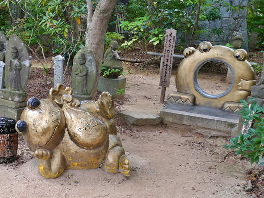 本堂の周辺にもたくさんのカエルがいますが、本堂の前を通って小山のさらに高いところへ行くと、寝転がったカエルや「くぐりかえる 幸せかえる」と書かれた、口の中を潜ると幸せになれるカエルもいました。