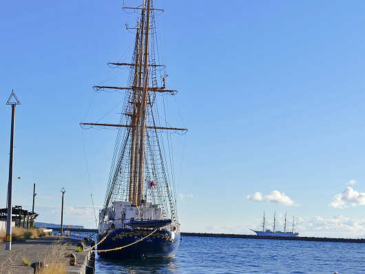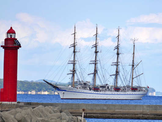 こちらが沖合に錨泊していた「帆船 日本丸」です。この帆船は全長110m、総トン数2570tもある大型帆船で、世界でも有数の高速帆船です。