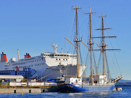 沖合に錨泊する「帆船 日本丸」を岸から撮影したら、「帆船 みらいへ」の接岸する岸壁へと向かいました。この帆船は全長52m、総トン数362tと、日本丸よりもかなり小型なので、作業船などが接岸するこの短い岸壁でも係留できるんですよね。向こうに見えているフェリーは総トン数が9245tの「さんふらわー こばると」です。