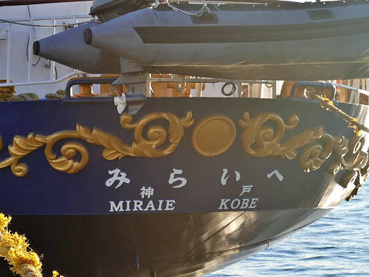車を停めたらさっそく「帆船 みらいへ」が係留されている岸壁へと行きました。船尾には神戸の文字が見えていますが、「帆船 みらいへ」は神戸港が母港なんですよね。