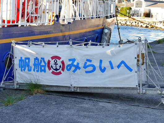 この帆船はグローバル人材育成推進機構が保有する航海練習船です。就航時には大阪市が保有する「 あこがれ」という船名の帆船でしたが、橋下徹さんが大阪市長の時に市政改革の一環で売却されて船名も「みらいへ」へと変更になったんですよね。