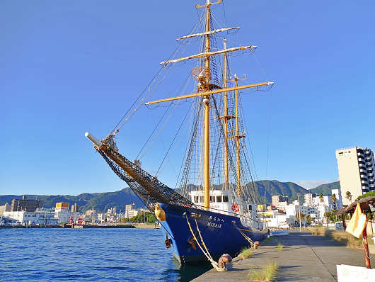 ここからは翌朝の画像になります。別府国際観光港に到着すると「帆船 みらいへ」は岸壁に接岸していて、そのはるか沖に「帆船 日本丸」は錨泊していました。別府国際観光港には帆船の見物に何度も訪れていますが、2隻の帆船を同時に見たのはこれが初めてです。