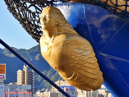 帆船 みらいへ の船首像(フィギュアヘッド)は、女性(女神)のようにも見えますが、日本武尊(ヤマトタケルノミコト)だそうです。ちなみに大型帆船の日本丸、海王丸の船首像は女神の「藍青(らんじょう)」と「紺青(こんじょう)」なんですよね。