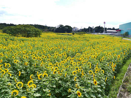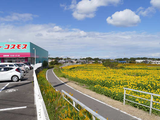 ヒマワリ畑の中には小道もあったので、畑の中へも入ってみました。向こうには「ドラッグストア コスモス」が見えていますが、コスモスと大きく書かれた看板の横にたくさんのヒマワリが咲いているのはちょっと違和感があるので、この時季だけでも「ドラッグストア ヒマワリ」って店名を変えたらと思うのは私だけでしょうか?(笑)