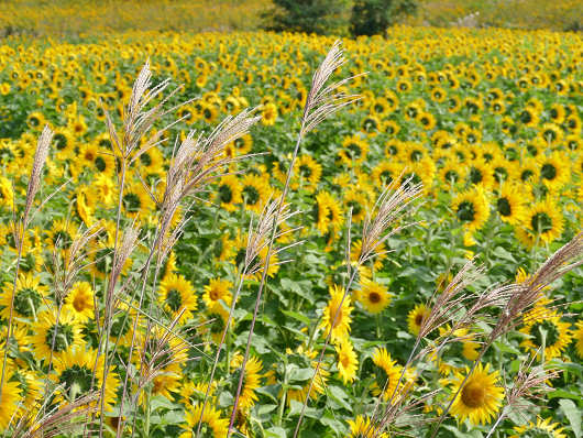駐車場から眺めたヒマワリ畑です。ここは1ha(100m×100m)の休耕田に7万本のヒマワリが植えられているそうですが、どこがヒマワリ畑の端っこなのか分からないほどの広さでした。