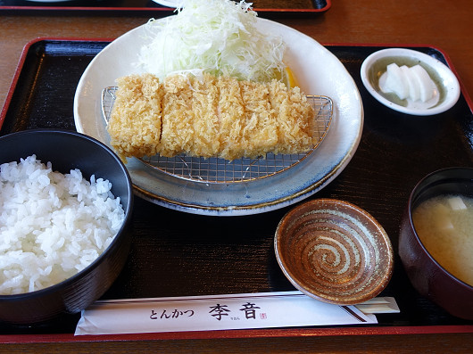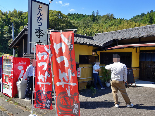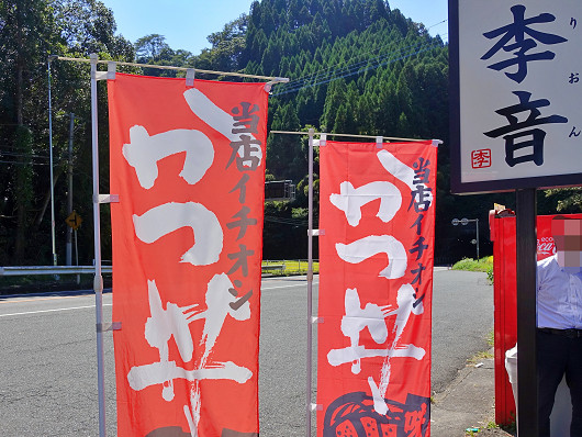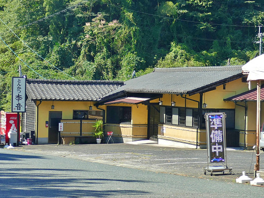 国道210号を8㎞ほど進むと右側に「とんかつ 李音(りおん)」と書かれた看板が見えてきます。ここがこれからお昼ご飯をいただくお食事処です。国道210号をこのまま進むとすぐにトンネルがあって、1.5kmほど先には「道の駅 慈恩の滝くす」があります。