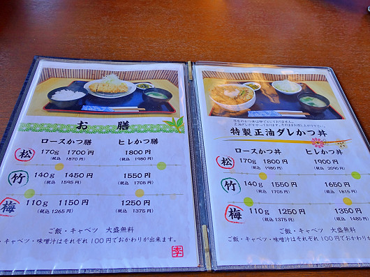メニュー表です。私はすでにカツ丼に決めていましたが、メニュー表を見ると肉の部位、重さを選べるようになっていたので、私は「ヒレかつ丼 140g」の竹を、りゅうママは「ロースかつ膳140g」の竹を注文しました。ここはご飯、キャベツの大盛は無料なので、私もりゅうママもキャベツだけを大盛にしてもらいました。