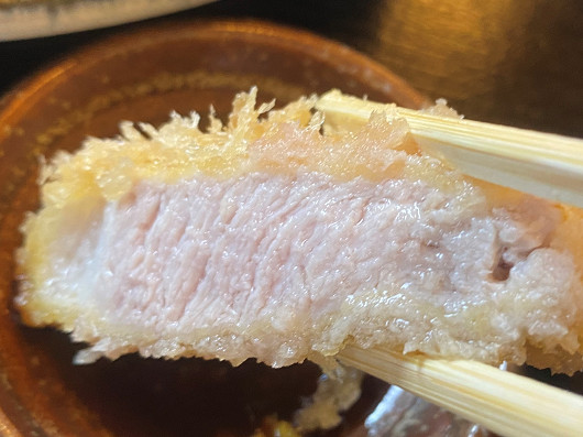肉の断面はこんな感じで、ロースかつ膳のお肉よりは若干火が通ってるかなって感じでしたが、この肉もとても柔らかくて、薬味類をご飯と混ぜてカツを一緒に食べたら、癖になる美味しさでまさに絶品でした。
