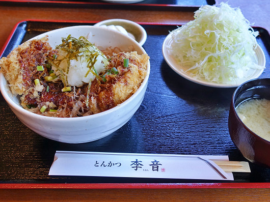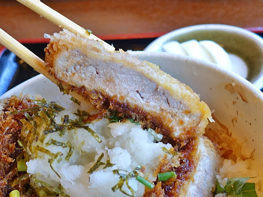 カツの上にはネギ、おろし大根、刻み海苔、大葉、そしてかつお節が乗っていて、特製の少し甘めの醤油ダレがかかっていて、何も味付けをせずにこのままで食べられるようになっていました。