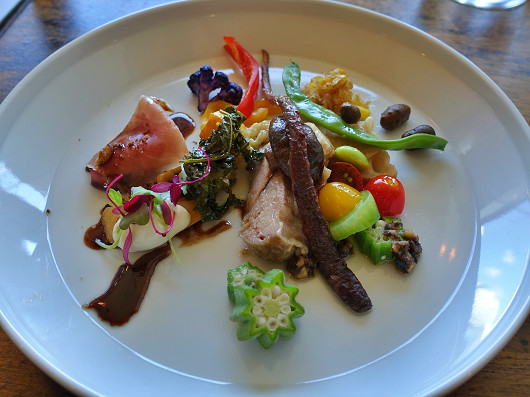 最初に出てきたのは若鶏のコンフィと、地元産の野菜をふんだんに使った旬の前菜です。いったい何種類の野菜があるんだろう?って感じで、色とりどりの野菜を目で楽しんで、口に入れると甘味、塩味、酸味など色んな味が楽しめました。