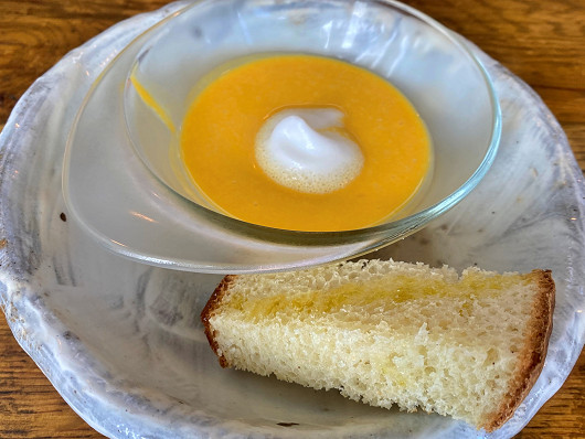 季節のスープはかぼちゃとココナッツの冷製スープで、横にはフォカッチャが付いていました。