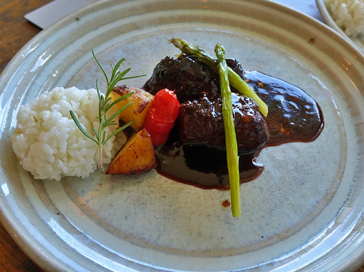 あか牛の煮込みです。でもなぜか横にはライス(おにぎり?)が付いていました。これにはりゅうママも何だかなぁ~っと言っていました(笑)フォカッチャが付いたほうがお洒落ですよね。