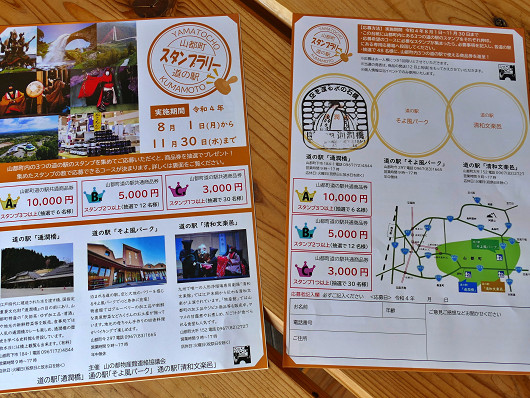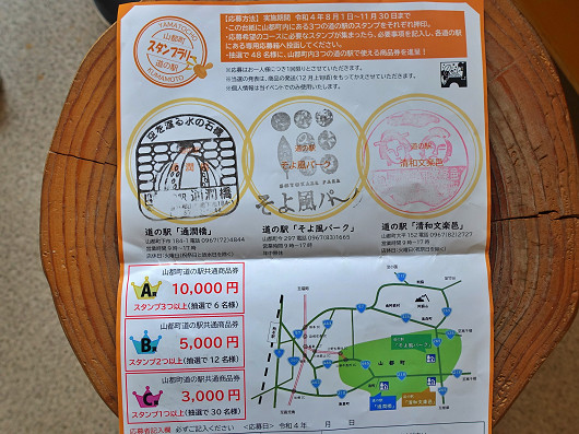上益城郡山都町(かみましきぐんやまとちょう)には、通潤橋、清和文楽邑、そよ風パークと3つの道の駅があって、道の駅 通潤橋にはこれら3つの道の駅を巡るスタンプラリーの用紙を置いていたのでスタンプを押しましたが、幸いなことに残り2つの道の駅は帰りの道路沿いにあって休憩による予定だったので、ついでにスタンプを押すことにしました。