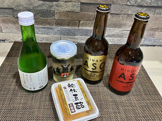 画像は山都町の道の駅で買ったものです。奥にあるのは道の駅 清和文楽邑で買った清酒と地ビールです。そして手前は道の駅 そよ風パークで買った豆腐のもろみ漬けの「秘伝豆酩(ひでんとうべい)」です。どちらもこの日の夜に「矢部のケンチキ」と一緒に美味しくいただきました。