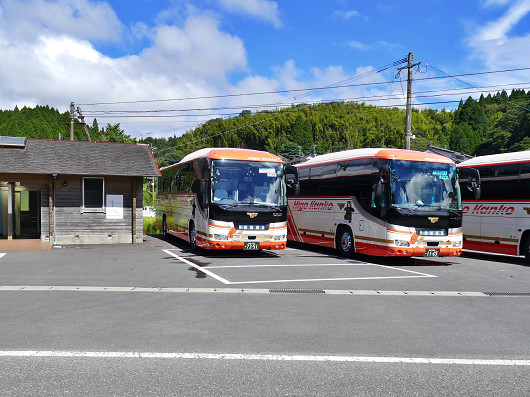 国道218号へ出て高千穂方面に2kmも走ると、円形分水の標識が見えてくるので、ここを左折して1kmほど山の中に向かって走ると駐車場が見えてきます。この駐車場にはトイレもあって普通車が十数台ほど停められそうでしたが、この時は大型バスが普通車のスペースに3台停まっていたので、私たちは隅っこにかろうじて車を停めました。