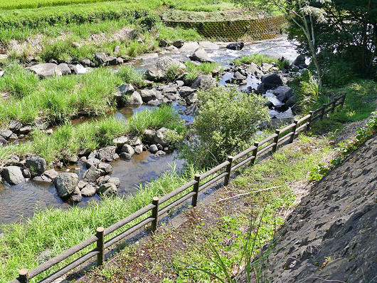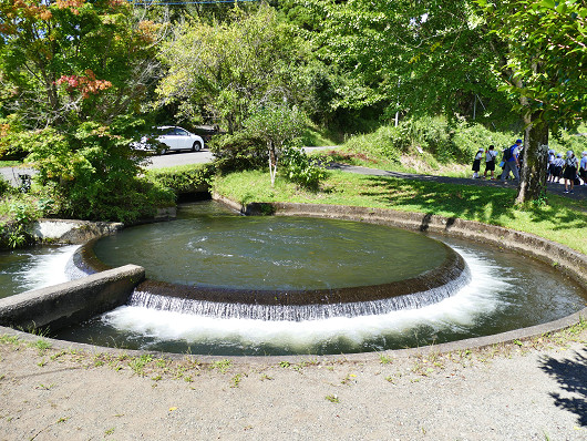 円形分水の10mほど下には川が流れていますが、川面より上にある円形分水から水が湧き出しているのはちょっと不思議な感じですが、円形分水はサイホンの原理を応用しているので、上流にある取水口はここよりもかなり高い位置にあるんでしょうね。